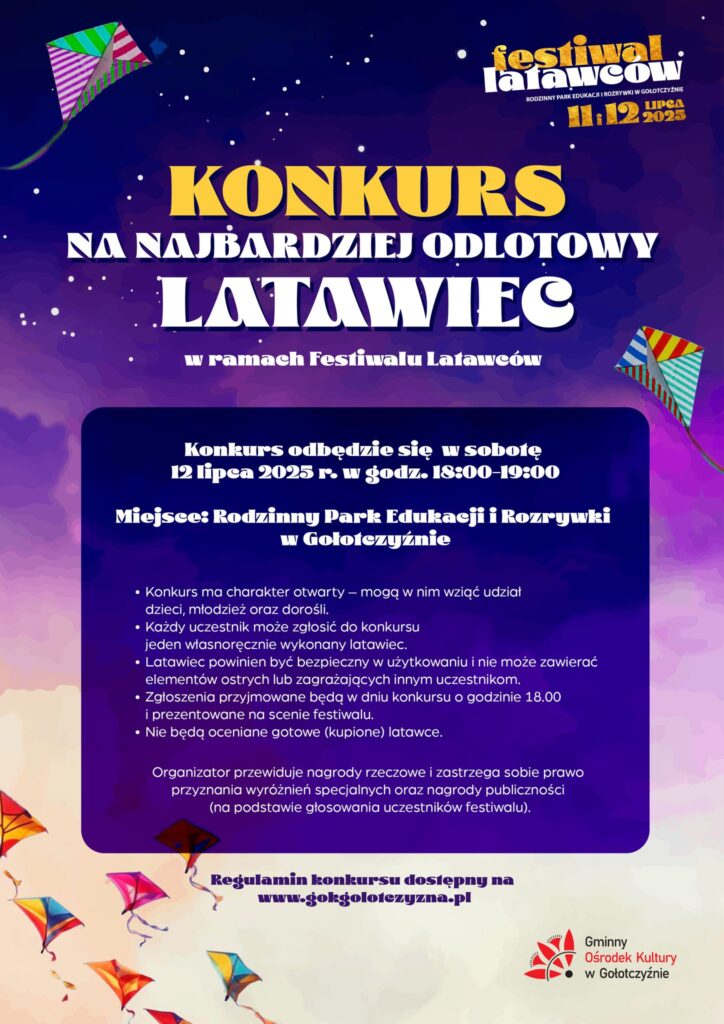 Jeśli macie pytania – prosimy o komentarz.Konkurs odbędzie się w sobotę 12 lipca 2025 r. w godz. 18:00-19:00Miejsce: Rodzinny Park Edukacji i Rozrywki w Gołotczyźnie• Konkurs ma charakter otwarty – mogą w nim wziąć udział dzieci, młodzież oraz dorośli.• Każdy uczestnik może zgłosić do konkursu jeden własnoręcznie wykonany latawiec.• Latawiec powinien być bezpieczny w użytkowaniu i nie może zawierać elementów ostrych lub zagrażających innym uczestnikom.• Zgłoszenia przyjmowane będą w dniu konkursu o godzinie 18.00 i prezentowane na scenie festiwalu.• Nie będą oceniane gotowe (kupione) latawce.Organizator przewiduje nagrody rzeczowe i zastrzega sobie prawo przyznania wyróżnień specjalnych oraz nagrody publiczności (na podstawie głosowania uczestników festiwalu).