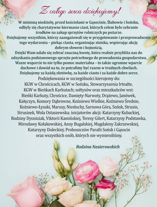 „Z całego serca dziękujemy!W minioną niedzielę, przed kościołami w Gąsocinie, Ślubowie i Sońsku, odbyły się charytatywne kiermasze ciast, których celem było zebranie środków na zakup sprzętów rolniczych po pożarze. Dziękujemy wszystkim, którzy zaangażowali się w przygotowanie i przeprowadzenie tego wydarzenia – piekąc ciasta, organizując stoiska, wspierając akcję dobrym słowem i hojnością. Dzięki Wam udało się zebrać znaczną kwotę, która realnie przybliża nas do odzyskania podstawowego sprzętu potrzebnego do prowadzenia gospodarstwa. Wasze wsparcie to nie tylko pomoc materialna – to także ogromne wparcie duchowe i dowód na to, że potrafimy być razem w trudnych chwilach. Dziękujemy za każdą złotówkę, za każde ciasto i za każde dobre serce. Podziękowania w szczególności kierujemy do: KGW w Chrościcach, KGW w Sońsku, Stowarzyszenia Irtealte, KGW w Bieńkach Karkutach; sołtysów oraz mieszkańców wsi: Bieńki Karkuty, Chrościce, Damięty-Narwoty, Drążewo, Janówek, Kałęczyn, Komory Dąbrowne, Koźniewo Wielkie, Koźniewo Średnie, Koźniewo-Łysaki, Marusy, Niesłuchy, Sarnowa Góra, Sońsk, Strusin, Strusinek, Wola Ostaszewska; inicjatorów akcji: Katarzyny Kubackiej, Rodziny Dyoniziak, Viktorii Kamińskiej, Teresy Gilert, Katarzyny Podstawka, Mirosławy Kołakowskiej, Anny Bugalskiej, Magdaleny Zakrzewskiej, Katarzyny Doleckiej; Proboszczów Parafii Sońsk i Gąsocin oraz wszystkich osób, których nie wymieniliśmy. Rodzina Nasierowskich”