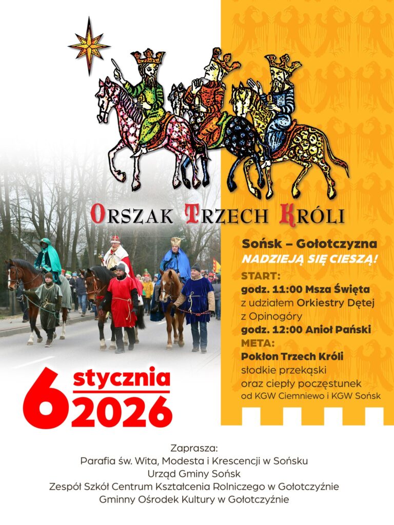 6 stycznia 2026 – widzimy się na Orszaku!Współorganizatorzy:Parafia św. Wita, Modesta i Krescencji w SońskuZespół Szkół Centrum Kształcenia Rolniczego w GołotczyźnieUrząd Gminy Sońsk
